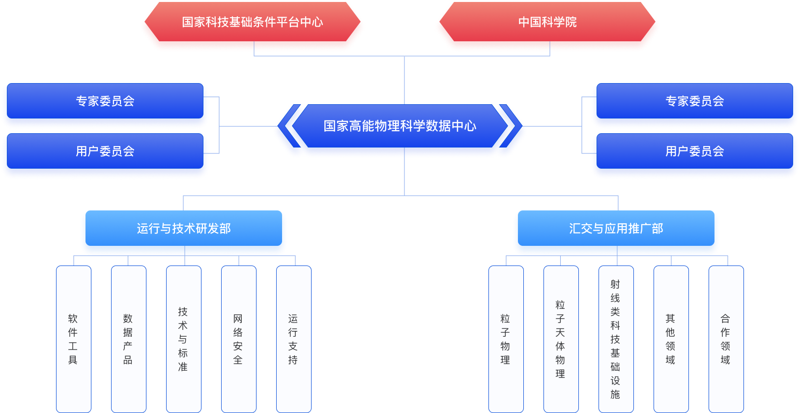 中心办公室负责数据中心日常运行的相关行政和支撑工作。数据中心下设运行与技术研发部和合作与应用推广部,具体承担国家高能物理科学数据中心涉及到的关键技术研发、平台日常运行、面向高能物理领域学科应用服务与国际间合作等工作任务。